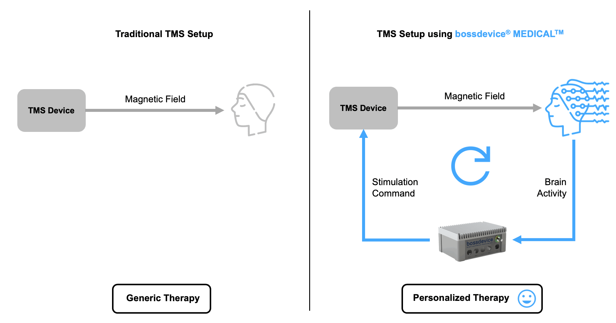 At sync2brain, we’re advancing TMS by honing in on its timing. Recognizing that every brain has unique oscillations and rhythms, our approach tailors magnetic stimulation to align with each patient’s specific neural patterns, maximizing the therapeutic impact. By using our bossdevice® developed in partnership with leaders in real-time computing and neuro-analytics, we achieve near-instantaneous synchronization with the brain’s natural cycles. This precision, validated through research, makes TMS more effective for conditions like depression and OCD and holds promise for broader neuropsychiatric applications.